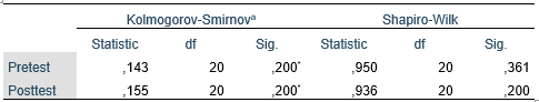 Pada tabel diatas, tentang uji normalitas terhadap data pretest dan posttest yang telah dilaksanakan dalam satu kelompok dengan berjumlah 20 siswa. Hal ini bertujuan untuk dapat memeriksa kembali data pada hasil minat belajar siswa di kelas IV B dapat dinyatakan berdistribusi normal atau tidaknya. Dengan adanya uji normalitas ini yaitu jika (nilai sig. lebih besar 0,05 maka dapat dinyatakan normal), jika (nilai sig. kurang dari 0,05 maka dapat dinyatakan tidak normal). Dengan begitu pada hasil uji normalitas tersebut menggunakan shapiro wilk dengan hasil uji normalitas yang dapat dilihat pada tabel shapiro wilk. Nilai signifikansi pretest dan posttest (0,361 dan 0,200). Dari hasil uji normalitas dapat disimpulkan bahwa antara pretest dan posttest yang diperoleh berdistribusi normal.