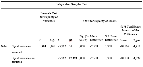 Berdasarkan hasil uji homogenitas menggunakan Levene’s Test, diperoleh nilai signifikansi sebesar 0,165 pada pengujian "based on mean". Karena nilai tersebut lebih besar dari 0,05, maka dapat disimpulkan bahwa data memiliki varians yang homogen antara kelas eksperimen dan kelas kontrol. Dengan demikian analisis dapat dilanjutkan dengan uji Independent Sample T-Test pada tabel di bawah ini: