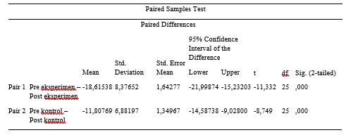 Kriteria dalam menentukan normalitas data menggunakan uji Shapiro-Wilk adalah apabila nilai Sig. > 0,05, sedangkan data dapat dikatakan berdistribusi tidak normal apabila nilai Sig. < 0,05 [19]. Berdasarkan tabel diatas hasil uji normalitas kelas eksperimen memperoleh nilai pos-test sebesar 0.101 dan kelas kontrol sebesar 0.261 maka dapat disimpulkan bahwa data berdistribusi normal. Setelah dilakukan uji normalitas, selanjutnya melakukan uji hipotesis dengan menggunakan uji PairedSamplesT-Test. Pada uji ini dilakukan perhitungan dengan menggunakan aplikasi SPSS 26 untuk mendeteksi perbedaan antara nilai pre-test dan post-test. Analisis dengan uji PairedSamplesT-Testdilakukan sebagai cara membuktikan ada atau tidaknya pengaruh treatmentyang diberikan. Hasil perhitungan PairedSamplesT-Test dapat dilihat pada Tabel 3.