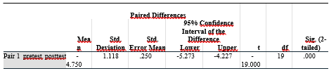 After the normality test shows normal distribution, then the data is tested using the paired sample t-test to test the hypothesis as an analysis method. This test aims to evaluate the success of an action shown by the average difference between before and after treatment. The results of the paired sample t-test on the pre-test and post-test are presented as follows.