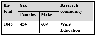 First: The research community:The current research community consists of male and female counselors in Wasit Education Directorate schools, numbering (1043) Guide and guide, and Table (1) shows the distribution of the research population according to the variables of gender and school type.