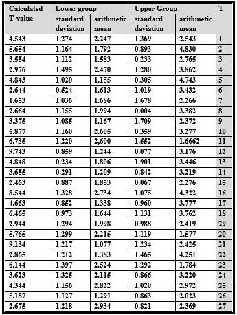 To calculate discriminatory power, the total scores obtained by the sample members after correction were arranged in ascending order from lowest to highest score on the questionnaires. The lowest 27% of scores were taken and designated the "lower group," and the highest 27% were taken and designated the "upper group." The researchers adopted the two extreme groups method, as Ebel and Mehernce indicated, because it provides two groups of the best possible size and differentiation [27].