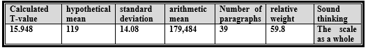 The statistical analysis also showed that when comparing the arithmetic mean of (179.484) for the sound reasoning scores with the theoretical mean of the scale of (119) using a one-sample t-test, the calculated t-value was found to be (15.948), which is statistically significant at a significance level of (0.05) and degrees of freedom of (149), as shown in Table 10 below.