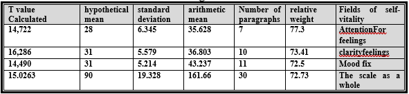 The table above shows that the skew ness and kurtosis coefficients for the scores of the self-vitality scale are (-1.865) and (2.452) respectively. Since neither of these coefficients exceeds the standard score (2.58), the distribution of the scores is a normal distribution. Accordingly, the researchers believe that the distribution of the meta-mood scores is a normal distribution, and its deviation from the typical distribution was small and had no statistical significance at the level of (0.01).