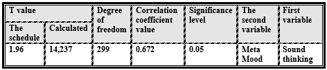 To achieve this objective and to determine the strength of the correlation between the Sound Thinking Scale and the Meta-Mood Scale among educational counselors, the researchers used Pearson's correlation coefficient between the two variables. The statistical analysis indicated a positive correlation between the Sound Thinking Scale and the Meta-Mood Scale, with Pearson's correlation coefficient between the two variables reaching (0.672). To test the significance of this correlation coefficient, the researchers used a t-test. The results showed that the calculated t-value of (14.237) was greater than the critical t-value of (1.96) at a significance level of (0.05) and degrees of freedom of (299). This means that the calculated t-value is statistically significant, as shown in the table.13).