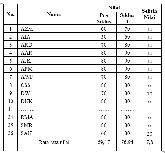 Figure 4. Gambar 3. Tabel Nilai Pra Siklus, Siklus 1 dan Selisih Nilai Siswa