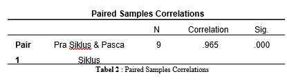 Jika nilai signifikansi (Sig) < (kurang dari) 0.05 maka dapat dinyatakan adanya hubungan yang signifikan antara sebelum dilakukan dan sesudah dilakukannya pelatihan literasi. Melalui hasil outpur kedua, diketahui nilai korelasinya adalah 0.965 dengan signifikansi 0.000, karena hasil signifikansi 0.000 < 0.05 maka dapat sisimpulkan bahwa adanya hubungan yang signifikan antara nilai tes sebelum dan sesudah dilakukannya pelatihan signifikansi. Jika nilai korelasi yang didapat semakin mendekati 1, maka dinyatakan memiliki hubungan yang semakin kuat. Jika nilai korelasi yang didapat mendekati 0 maka hubungan korelasinya semakin lemah. Melalui data diatas diketahui nilai korelasinya adalah 0. 965 (mendekati 1) maka dapat disimpulkan bahwa hubungan yang terjadi kuat.[20]