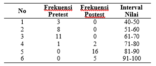 Pada tabel 1, dapat dilihat bahwa skor pretest menunjukkan tingakt kemampuan siswa sebelum dilakukan treatment atau perlakuan, nilai terendah pretest berada diangka 50 dan tertinggi diangka 72. Sedangkan pada nilai Postest menunjukan peningkatan nilai yang signifikan, nilai terendah 80 dan yang tertinggi 92. Maka dapat disimpulkan bahwa terjadi peerbedaan antara hasil dari Pretest dan Postest sebelum diberikan perlakuan dan sesudah diberikan perlakuan.