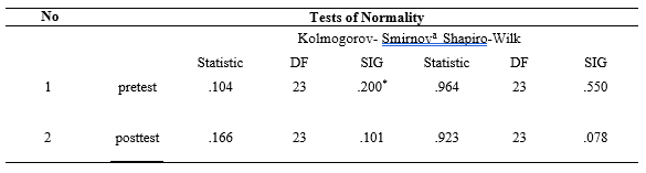 Berdasarkan hasil dari uji normalitas Shapiro-Wilk diatas nilai dapat diketahui bahwa nilai signiifkansi pretest yaitu 0,550 dan nilai signifikansi posttest yaitu 0.078, sehingga dapat disimpulkan bahwa data yang digunakan dalam penelitian ini berdistribusi normal.