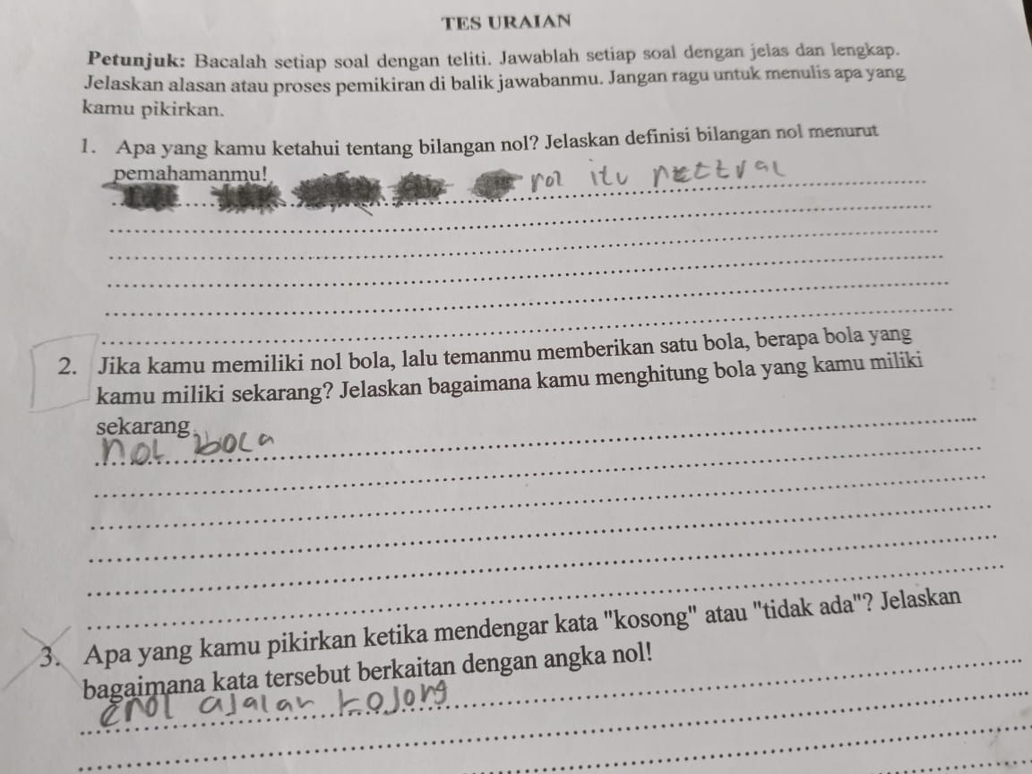 Dari sini dapat disimpulkan bahwa siswa 1 mampu membaca soal dengan baik, namun tidak dapat memahami konsep nol sebagai bilangan netral. Siswa 1 menganggap bahwa nol adalah "angka kosong" atau "tidak ada nilai" dalam hasil tes tulis, tanpa menyadari perannya sebagai identitas dalam penjumlahan. Hal ini menunjukkan bahwa siswa tersebut belum memahami konsep dasar bilangan nol sebagai bilangan netral serta tidak bisa memberikan definisi yang benar tentang bilangan nol (0). Siswa mengalami kesalahan atau kesulitan dalam menjelaskan pengertian dari bilangan nol. Hal ini sesuai dengan temuan yang menyatakan bahwa siswa cenderung menganggap nol sebagai "tidak ada apa-apa" dan tidak memahami perannya dalam operasi matematika [14]. Kemudian ditemukan juga siswa yang tidak bisa membedakan kosong dan tidak ada terkait definisi dari bilangan nol. Hal ini dapat dilihat dari jawaban siswa berikut.