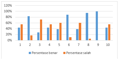 Gambar 1 menunjukkan hasil penyelesaian soal bilangan nol oleh siswa kelas V SD. Grafik menunjukkan presentase jawaban benar dan jawaban salah diantara siswa. Dari grafik tersebut, terlihat bahwa siswa mengalami kesulitan yang bervariasi pada setiap soal. Pada grafik ini, terlihat jelas bahwa enam pertanyaan yang memiliki persentase salah melebihi 50% yang menunjukkan bahwa pemhaman siswa terhadap bilangan nol masih rendah. Rendahnya tingkat pemahaman bilangan nol terkait erat dengan keberadaan miskonsepsi. Dalam penelitian ini lima indikator telah diidentifikasi untuk menilai apakah siswa mengalami miskonsepsi. Berikut ini adalah beberapa miskonsepsi yang terkait dengan lima indikator tersebut.
