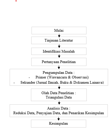 Penelitian ini dilakukan melalui tahapan yang sistematis dengan mengikuti langkah-langkah yang bersifat ilmiah dan logis yang dimana untuk memastikan pelaksanaan penelitian dapat berjalan sesuai rencana dan menghasilkan data yang akurat serta dapat terselesaikan secara tepat waktu dengan menghasilkan hasil yang sesuai dengan tujuan yang diharapkan [19]. Dalam penelitian ini terdiri dari beberapa tahapan utama yang dirancang untuk menghasilkan temuan yang mendalam dan relevan. Tahapan pertama yang dilakukan yaitu melakukan tinjauan literatur yang bertujuan untuk memahami konsep dan teori yang mendasari serta merumuskan landasan penelitian. Tahapan kedua yaitu identifikasi masalah yang digunakan untuk menentukan fokus utama penelitian, diikuti dengan penyusunan pertanyaan penelitian sebagai panduan dalam menjalankan proses penelitian secara terarah. Selanjutnya, pengumpulan data yang dilakukan melalui metode primer, seperti wawancara dan observasi dan sekunder dilakukan dengan meninjau dokumen dan referensi terkait. Analisis data dilakukan melalui tiga tahap utama : reduksi data, yaitu penyaringan dan peringkasan informasi menjadi teks naratif dengan bukti pendukung seperti petikan wawancara. Penyajian data, yaitu penyusunan informasi secara terstruktur untuk menyoroti hubungan antara temuan dan tujuan penelitian. Penarikan simpulan, yaitu pengintegrasian hasil analisis untuk menjawab pertanyaan penelitian secara akurat. Untuk menjamin validitas hasil, penelitian ini menggunakan teknik triangulasi data pada setiap analisis. Triangulasi dilakukan dengan membandingkan konsistensi jawaban dari para narasumber yang diwawancarai pada waktu yang berbeda serta memverifikasikan data dengan dokumen pendukung yang relevan. Dengan pendekatan ini, hasil analisis diharapkan bersifat lebih objektif, akurat dan mendalam [20].