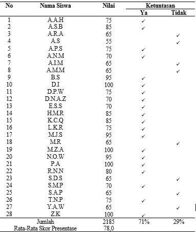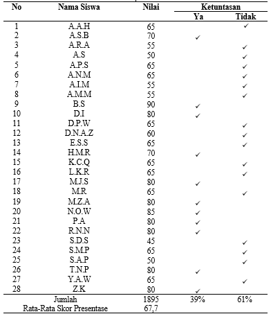 Hasil belajar peserta didik pada pembelajaran saat pre test yang di berikan, dari jumlah peserta didik keseluruhan 28 peserta didik. Peserta didik yang mendapat nilai tuntas sebanyak 11 peserta didik dengan persentase 39% dan yang tidak tuntas sebanyak 17 peserta didik dengan persentase 61%. Hasil tersebut menunjukan bahwa hasil belajar peserta didik masih kurang sehingga belum mencapai indikator keberhasilan 85% yang di harapkan.